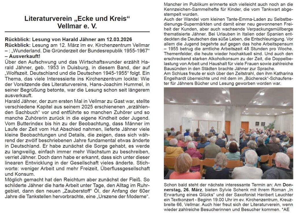 bezeichnen könnte. Am Donnerstagabend gab der Autor Kostproben aus seinem Bestseller im Evangelischen Kirchzentrum Vellmar. 100 Gäste waren der Einladung des örtlichen Literaturvereins „Ecke und Kreis“ gefolgt. „Das Buch hat mich so begeistert, dass ich es gerne in unserem Programm